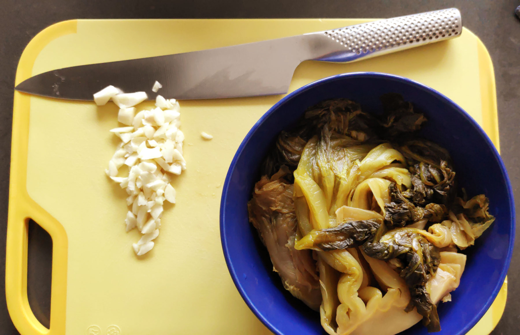 Verhit in een wok olie en fruit hierin de in stukjes gesneden knoflook.