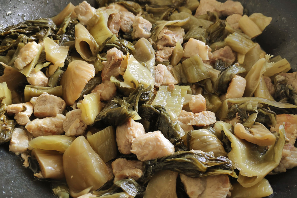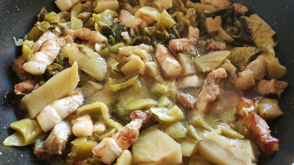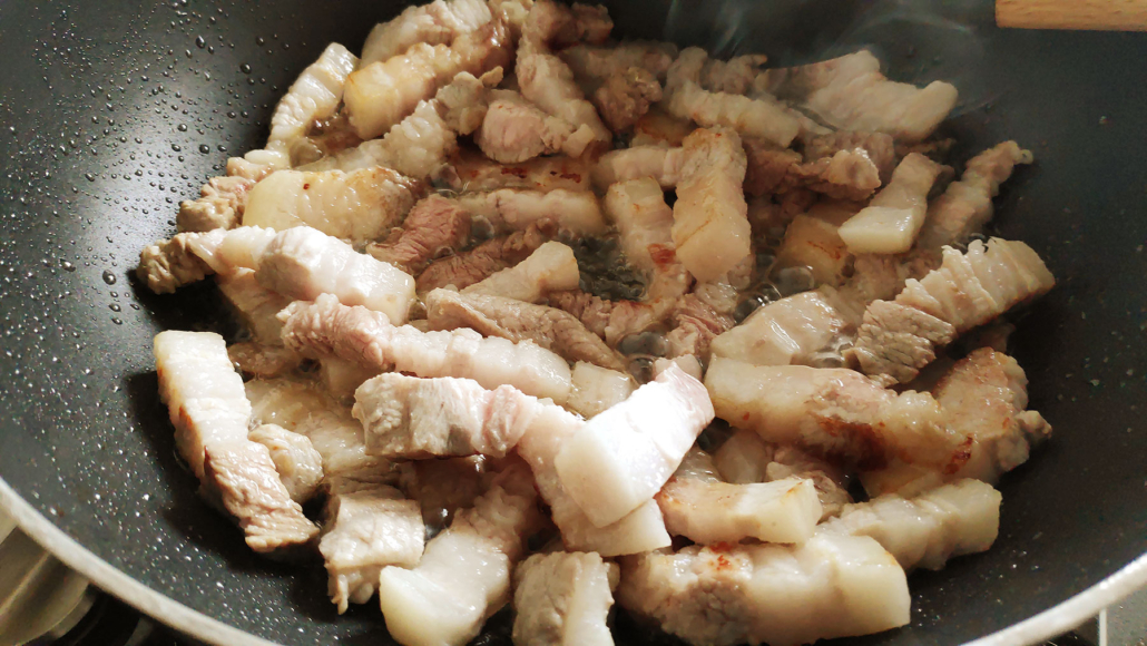 Was het varkensvlees, laten uitlekken en in blokjes snijden van ongeveer 2 cm.