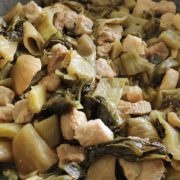 Daarna de amsoi, sojasaus, oestersaus, suiker en ve-tsin erbij doen, even omscheppen en een glas water aan toevoegen.