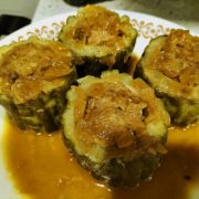 Een gleufje maken, voorzichtig wat eruit krabben en een theel. gehakt erin doen, het gehakt moet aan de bovenkant er uitsteken.